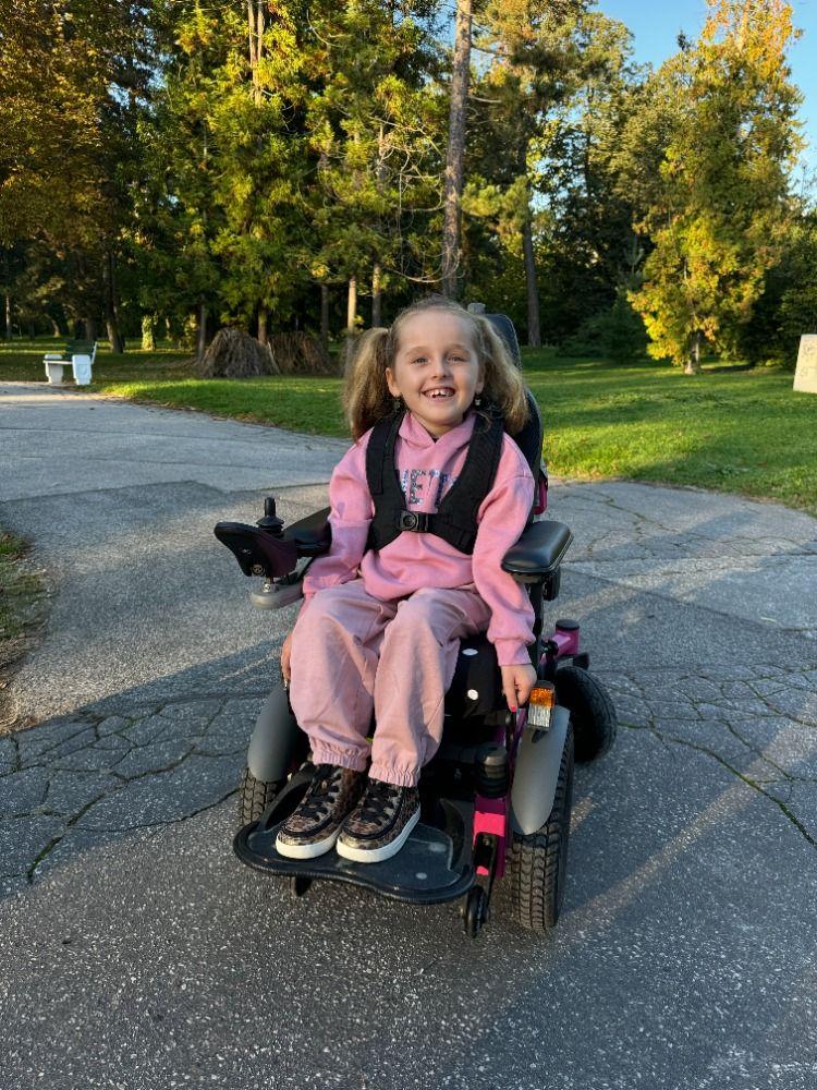 Despite all the hardship she has endured in hospitals, despite the tens of thousands of kilometers she has had to travel for treatment, and despite her significant physical disability, she is a little girl who shares smiles with everyone around her. She is sociable, bright, and curious. She loves spending time with her friends, enjoys good food, educational programs, puzzles, and even school. She likes wearing dresses, getting into mischief, playing cards, reading books, and she absolutely loves swimming.